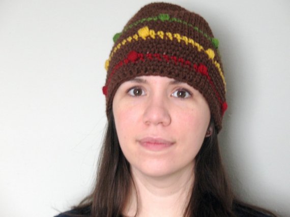 Made from a soft acrylic yarn, the hat is washable, breathable, and warm. Green, Yellow, and Olive stripes add just the right touch of color to this chocolate brown staple. This beanie is size large.